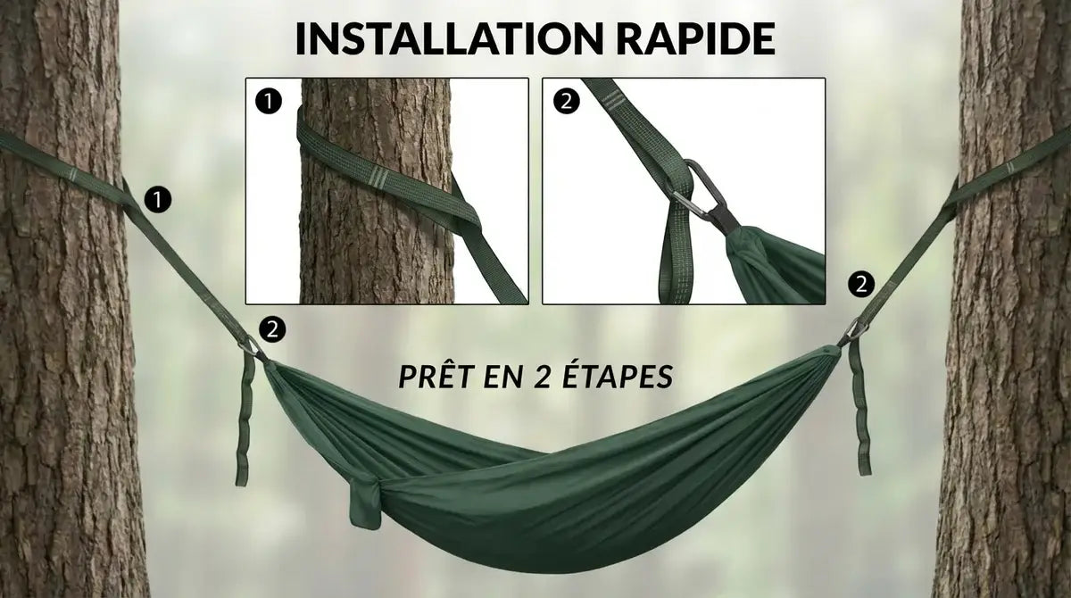 Oubliez la galère des nœuds ! Accrochez votre hamac en 60 secondes chrono grâce aux sangles intelligentes et mousquetons en acier inclus. Moins d'efforts, plus de temps pour vous détendre.